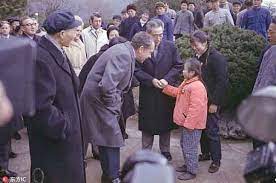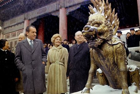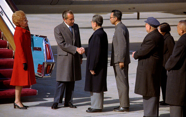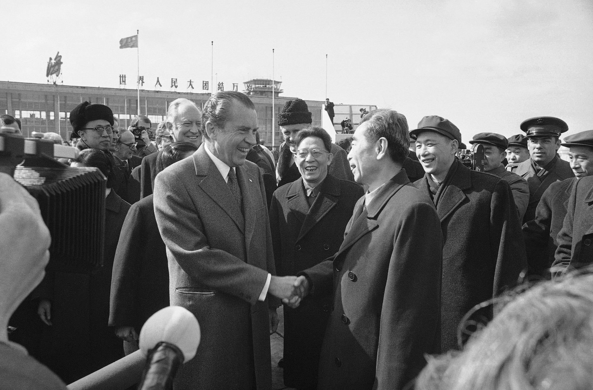 On February 21, 1972, Nixon stepped off Air Force One, was greeted by Zhou, and proceeded to meet with Mao.